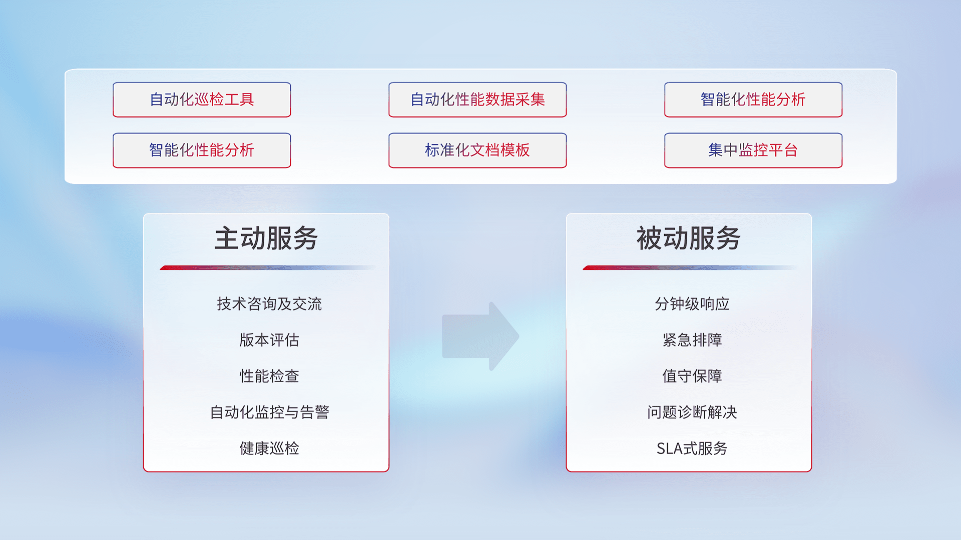 智能化工具和标准化文档,,,,保障服务质量,,,提供主动服务(包含技术咨询、、、、版本评估、、、、性能检查、、、自动化监控与告警、、、健康巡检)和被动服务包含(分钟级响应、、紧急排障、、、值守保障、、、、问题诊断解决、、、、SLA服务)。。。。